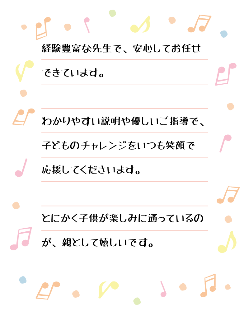 お子さまの着実な成長に寄り添った、心のかよったレッスンをお約束します。
