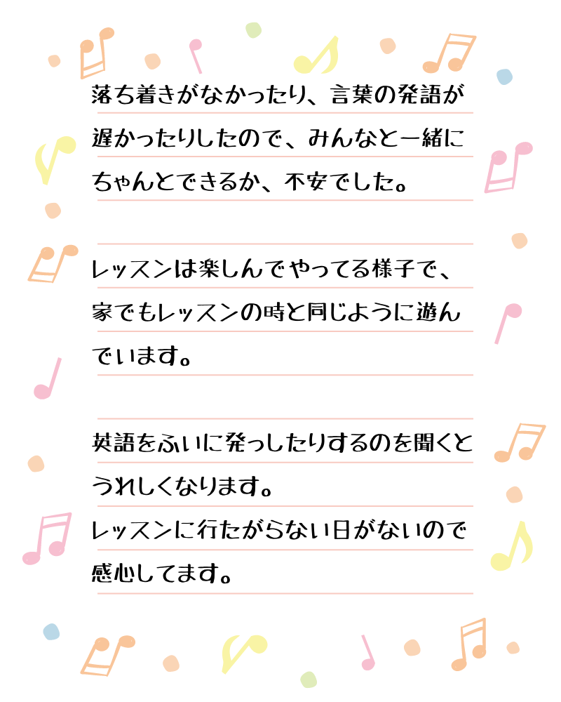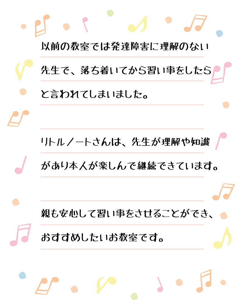 当教室には、発達障がいのお子さまも多数在籍しており、みなさんレッスンを楽しまれています。